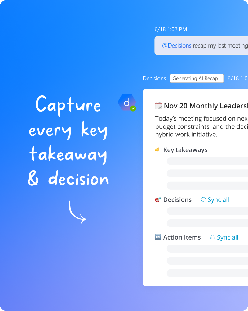 Capture notes, decisions, and tasks automatically in Microsoft 365. With AI summaries and task sync, Decisions keeps every meeting on track.