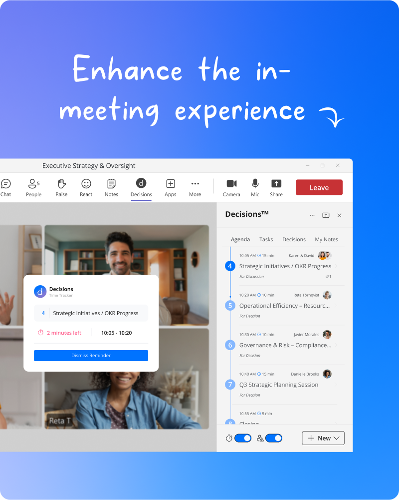 Run smarter meetings in Microsoft Teams, with AI-powered agendas, summaries, and task tracking. Decisions helps teams stay organized, productive, and outcome-driven—at scale.